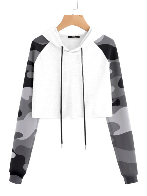 Women's Cotton Blend Regular Raglan Camouflage Cropped Hooded Neck Sweatshirt for Both Winter & Summer Wear